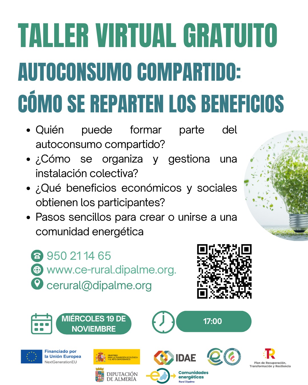 ¿Cómo se reparten los beneficios del autoconsumo compartido? Desde la Oficina de Transformación Comunitaria (OTC) de la Diputación de Almería, te invitamos a participar de un taller virtual gratuito dirigido a