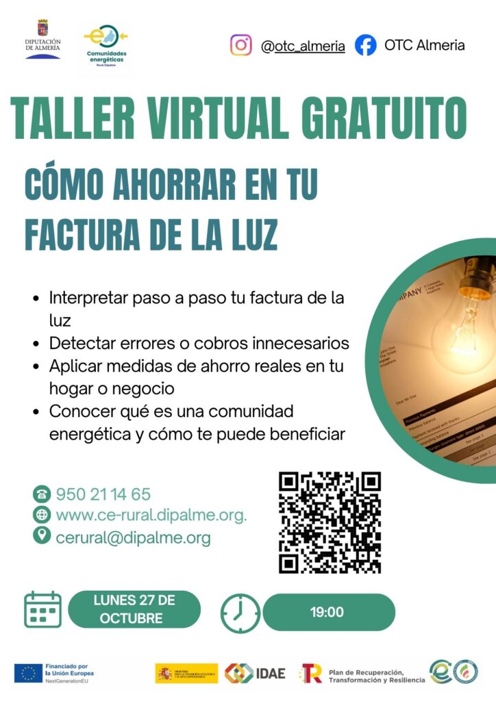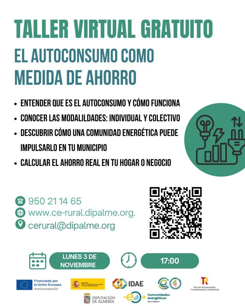 ¿Quieres reducir tu factura de luz y apostar por la energía sostenible? Las Oficinas de Transformación Comunitaria de la Diputación de Almería te invitan al taller virtual gratuito “El autoconsumo como medida de ahorro”, donde descubrirás: Qué es el autoconsumo energético y cómo funciona. Las modalidades disponibles: individual y colectivo. Cómo una comunidad energética local […]